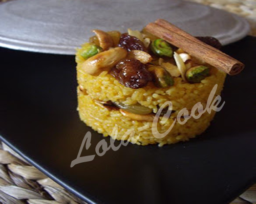 10- فى صحن تقديم كبير، يغرف الأرز على شكل جبل مستدق الطرف، ويسكب أعلاه خليط الرمان والبصل، ثم ينثر عليه اللوز والفزدق المحمص.