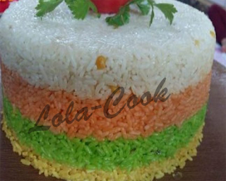 8- يزين قالب الأرز الملون بعود كزبرة أعلاه، ويقدم مع اللحوم أوالدجاج وسلطة لبن الزبادى.